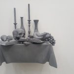 Prima di uscire, per rimettere le cose in equilibrio, ho potuto riflettere un attimo sull’opera del belga Hans Op de Beeck (1969), presentata dalla galleria Continua (San Gimignano, Pechino, Boissy le Châtel, L’Avana): il suo “Vanitas 14” del 2017, in gesso sintetico, è una natura morta solida, scolpita in grigio monocromo che, alludendo ai dipinti di epoche precedenti, rappresenta un attuale memento mori e, insieme, la natura transitoria dell’esistenza umana.