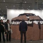 Si passa sotto l’opera intessuta di stelle (europee?) di Serena Vestrucci (1986) attraversando lo stand di Otto Zoo (Milano), mentre da Loom (Milano) si può vedere una scultura con matite e filo d’acciaio inox dell’artista francese Pierre-Etienne Morelle (1980, vive e lavora a Berlino), che ama esaminare le relazioni e le tensioni tra lo spazio e i corpi, realizzando dei leggeri solidi geometrici svuotati, che possono ricordare trattati rinascimentali.