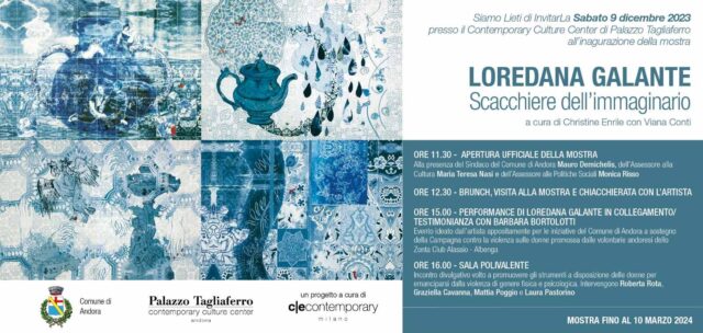 Ad Andora sabato nattina ci sarà alle 11 e 30 a Palazzo Tagliaferro l’inaugurazione della mostra di Loredana Galante “Scacchiere dell’immaginario”. Alle 12 e 30 è in programma il Brunch con l’artista ed alle ore 15 performance e testimonia