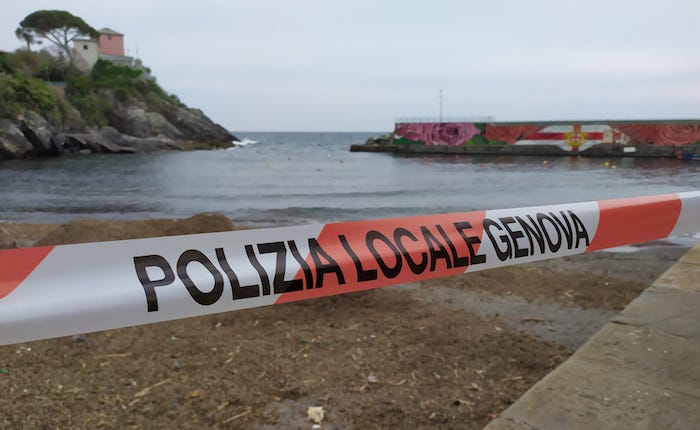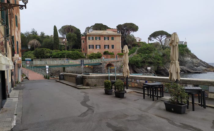 La passeggiata a mare Anita Garibaldi chiusa e nel porticciolo di Nervi sostanzialmente nessuno in giro.