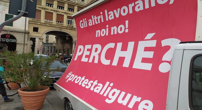 In piazza non solo i lavoratori di bar, ristoranti e locali da ballo, ma anche quelli dello sport, piscine, palestre, centri fitness, balneari, sale Bingo, catering, scuole di danza, fotografi, cinema, commercio, accompagnatori turistici, spettacolo, Teatro Carlo Felice e i tassisti che all’inizio hanno colorato la manifestazione pacifica con un paio di botti e fumogeni.