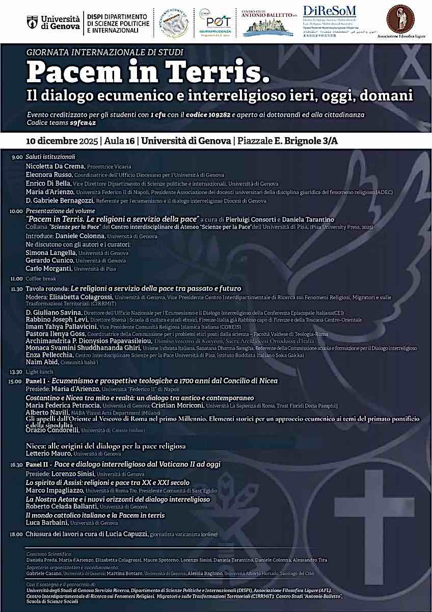 Il 10 dicembre 2025, nell’Aula 16 dell’Università di Genova in Piazzale Brignole 3/A, si svolge la Giornata Internazionale di Studi Interdisciplinari: Pacem in Terris. Il dialogo ecumenico e interreligioso ieri, oggi, domani. L’iniziativa nasce per approfondire, in una prospettiva interdisciplinare, le sfide contemporanee legate alla pace, ai diritti umani e al dialogo tra fedi diverse, temi che tornano oggi centrali in un contesto globale segnato da nuovi conflitti e tensioni.
