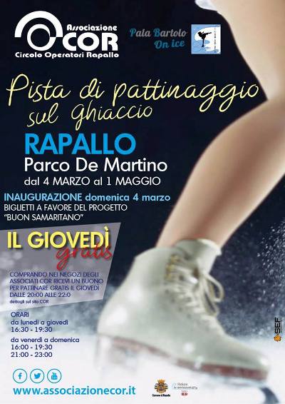 Da domenica 4 marzo sino al primo maggio “Si pattina al mare…!” a Rapallo. Il Cor, insieme a PalaBartoloOnIce e LiguriaGhiaccio, ripropone presso il centrale Parco De Martino della città di Rapallo la pista di pattinaggio sul ghiaccio! Dal lunedì al giovedì si potrà pattinare dalle ore 16.30 alle 19.30, e da venerdì alla domenica dalle 16.00 alle 19.30 e dalle 21.00 alle 23.00.