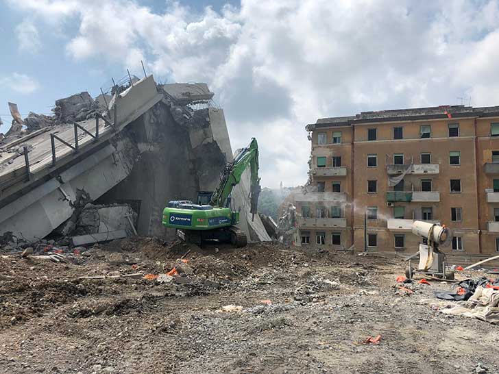 Nel contempo si provvede alla demolizione e movimentazione delle macerie e dei detriti al di fuori delle aree consegnate alle attività peritali sempre utilizzando l’attività di mitagazione delle polveri tramite i ‘fog cannon’ che sparano da 3 ai 5mila litri d’acqua nebulizzata al giorno.