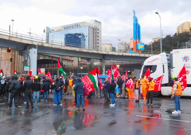 “Oggi siamo qui in corteo – hanno spiegato i manifestanti genovesi – per provare a bloccare la logistica della guerra, che s’inizia anche dal nostro porto, come la lotta del Calp di Genova (Collettivo autonomo lavoratori portuali) ci ha insegnato”.
