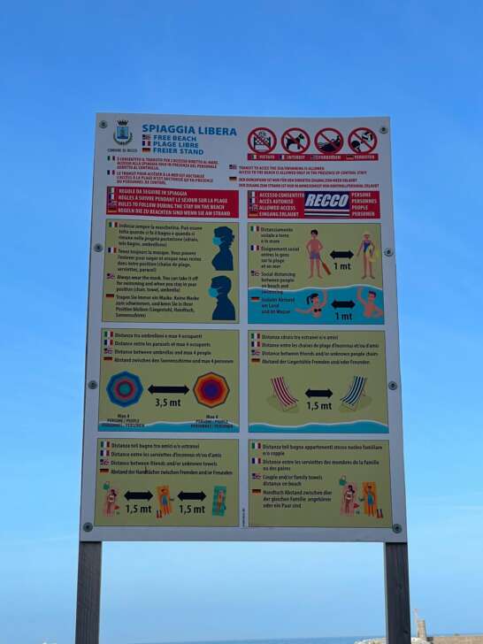 Un cartello indica le regole da rispettare tra cui obbligo di mascherina, tranne quando si fa il bagno e si rimane nella propria postazione, rispetto delle distanza di 3,5 metri tra gli ombrelloni e di 1 metro tra le persone, anche in acqua, 1,5 metri tra i teli bagno e le sdraio, a meno che non si appartenga allo stesso nucleo familiare.