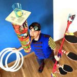 Il folle artista di strada di volta in volta si cimenterà in numeri di alta giocoleria, clowneria, equilibrio. L’esplosione a raffica di gag stupirà chiunque gli capiterà a tiro fino al tanto atteso applauso. Sfidando con coraggio i limiti umani della serietà, dell’equilibrio e della gravità, Riky mostrerà diversi numeri del repertorio circense, fra cui l’attesissimo e originalissimo «equilibrio mostruoso».