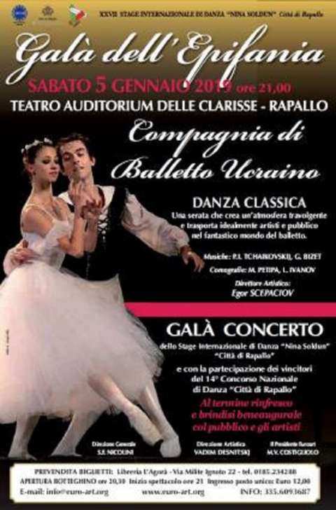 Trio Odalische; Colombina; Danza Spagnola; Pas de Deux Corsaro; Danza Russa; Pas de Esclave; Coda Fine spettacolo : Tutti i danzatori nella Coreografia di Egor Scepaciov. Direzione di Egor Scepaciov- Direttore Accademia Ucraina di Balletto. Prevendita Libreria Agorà – Rapallo – Via Milite Ignoto 22. Tel.:0185 23 42 88. Per Informazioni: Euroart tel.: 335 60 93 687.