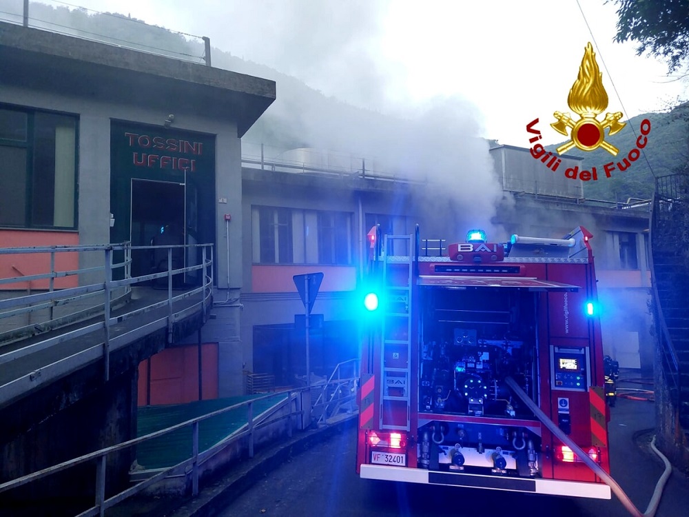 Lo stabilimento dei fratelli Tossini ad Avegno, si è incendiato in vari settori alle ore 5 di questa mattina 2 giugno. Sono i reparti dove si confeziona cibi e dolci con cui viene rifornita, in parte, la catena di negozi di Recco e del Levante.