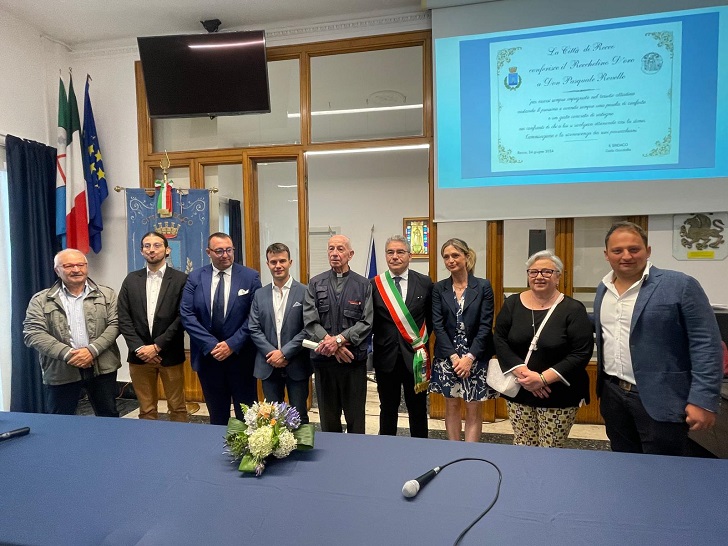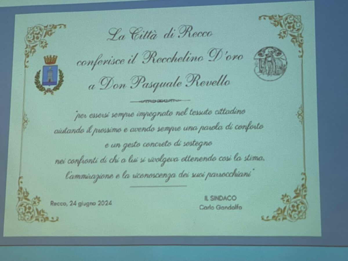 A don Pasquale Revello, già parroco della città di Recco viene conferito il prestigioso “Recchelino d’oro”. A consegnare l’ importante riconoscimento il sindaco di Recco Carlo Gandolfo nella Sala del Consiglio comunale gremita di cittadini, che hanno dimostrato l’affetto che la comunità nutre per Don Revello.