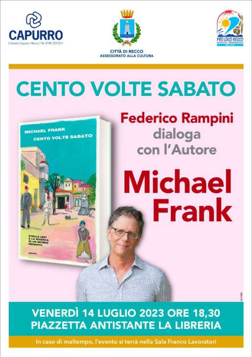 Lo scrittore Michael Frank, presenta il suo libro “Cento volte sabato, Stella Levi e la ricerca di un mondo perduto” venerdì 14 luglio alle ore 18.30, nella piazzetta antistante la libreria Capurro, In Recco. La presentazione è con il patrocinio del Comune di Recco, assessorato alla cultura e di Pro Loco.