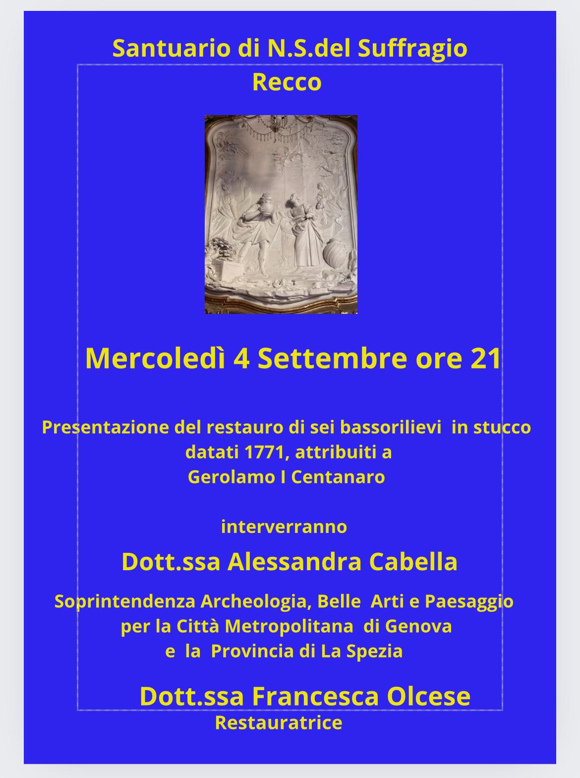 Mercoledì 4 settembre alle ore 21, il Santuario di Nostra Signora del Suffragio a Recco aprirà le sue porte per mostrare al pubblico il risultato di un intervento di restauro che ha riportato alla luce la bellezza originaria di sei preziosi bassorilievi in stucco risalenti al 1771.