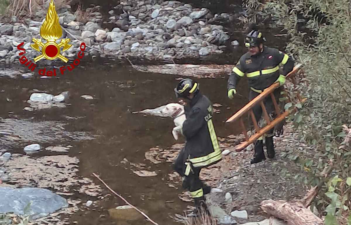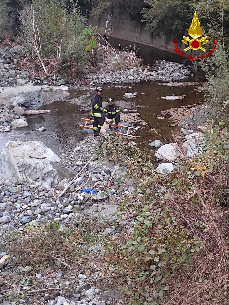Rossiglione, cane cade nel torrente mentre rincorre un capriolo: salvato dai Vigili del Fuoco