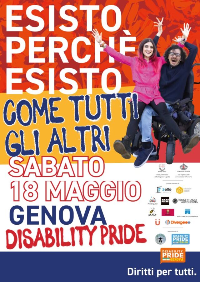 Sotto il claim “Esisto perché esisto, come tutti gli altri”, il Disability Pride Genova vuole ribadire il diritto fondamentale di ogni persona ad esistere e a vivere una vita piena e dignitosa, indipendentemente dalla propria condizione fisica, psichica o sensoriale.