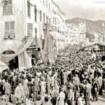 Foto 6 La seconda edizione della Sagra del Pesce del 1953 ebbe ancora maggior successo della prima. In tutta fretta si dovettero raddoppiare le postazioni dei banchi di friggitoria, sparsi per tutta la città. Nella foto si vede l’enorme folla che quel giorno si riversò su Camogli, non preparata a tanto. Tutte le vie e le piazze erano talmente colme che divenne impresa ardua anche soltanto camminare.