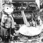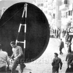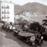 L’arrivo a Camogli della prima grande padella, qualche giorno prima della Sagra del Pesce organizzata per il 9 maggio 1954. Costruita in ferro dall’Officina Metalli di Calata Gadda a Genova, era larga oltre quattro metri di diametro, pesava undici quintali ed aveva un manico di oltre sei metri di lunghezza, che fungeva da camino.