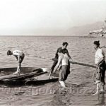 Foto 3 La padella, finalmente varata in mare, è pronta per le prove di galleggiamento. Per fortuna il mare è in calma piatta. “Già che ci siamo, si dà una bella lavata all’interno.” Nella foto si riconoscono, da destra sulla spiaggia, il “Cen” (Lorenzo Gelosi), il “Napoli” (Lorenzo Viacava) con in mano una cima ed il figlio di questi, “Giuse” (Giuseppe Viacava) che “da bordo” maneggia una pennola per allontanarsi dalla riva.