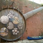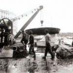 Foto 4 La padella, issata dall’acqua mediante la vecchia mancina del porto, è in attesa del montaggio del manico e dell’arrivo della barca su cui verrà caricata. La vecchia mancina, in funzione ininterrottamente dal 1840, è stata donata dal porto di Marsiglia a quello di Camogli. Sebbene tecnicamente ormai superata, ancora una decina di anni fa svolgeva egregiamente il suo lavoro.