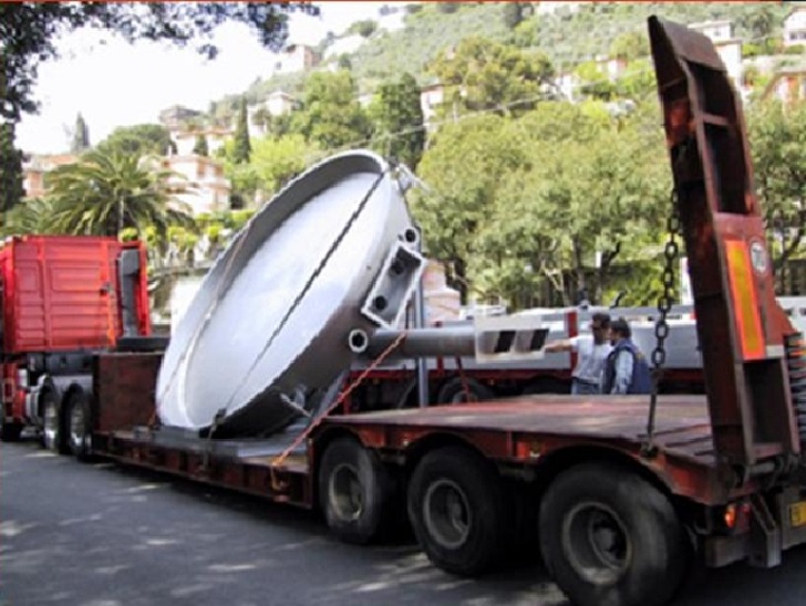 Foto 2 La Padella, dopo aver raggiunto Camogli con il camion a rimorchio, viene con fatica portata verso Piazza Colombo. Ritenendo difficoltoso, per le sue dimensioni ed il suo peso, farla passare sotto l’arco tra la Passeggiata e Piazza Colombo, si pensa di portarla sulla riva del mare, alandola sulla spiaggia, “vararla” e, una volta in acqua, rimorchiarla in porto.