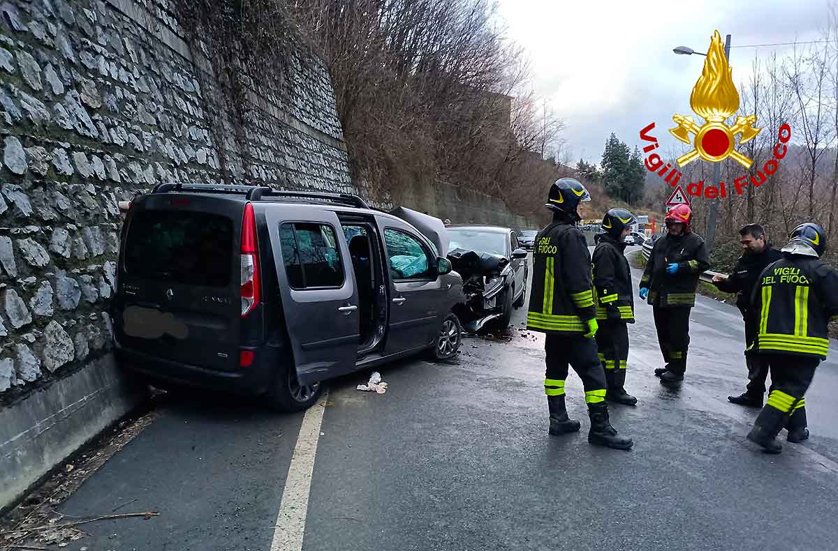 Savignone, scontro frontalmente tra due auto: una Renault Kangoo ed una volkswagen.