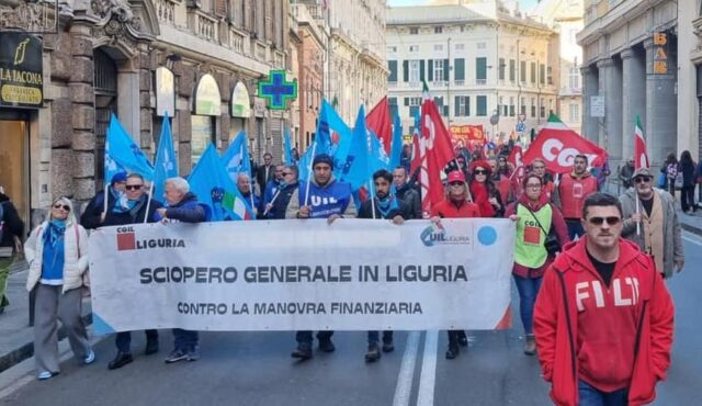 Il corteo, partito da Stazioni Marittime e arrivato sotto lil palazzo della Prefettura in via Roma, era aperto dallo striscione “Sciopero nazionale anche in Liguria contro la manovra finanziaria”.