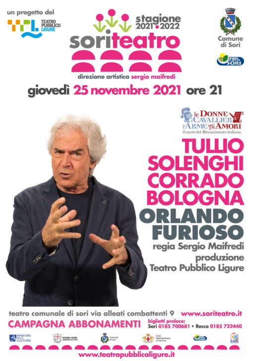 Tullio Solenghi e Corrado Bologna, un attore e un professore diretti da Sergio Maifredi, giovedì 25 novembre 2021 (ore 21) saranno insieme sul palco di Soriteatro per fare rivivere la forza e il divertimento dell’Orlando furioso di Ludovico Ariosto. Approda così nella Stagione 2021/22 di Soriteatro, prodotta da Teatro Pubblico Ligure con la direzione artistica di Sergio Maifredi, una produzione di TPL che fa parte del più ampio progetto “Le donne, i cavallier, l’arme, gli amori.