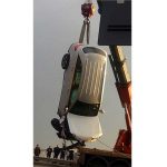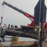L’auto è rimasta pericolosamente sospesa nel vuoto grazie al supporto del guard rail. Poi è stata imbragata e sollevata con l’autogru dei Vigili del Fuoco.