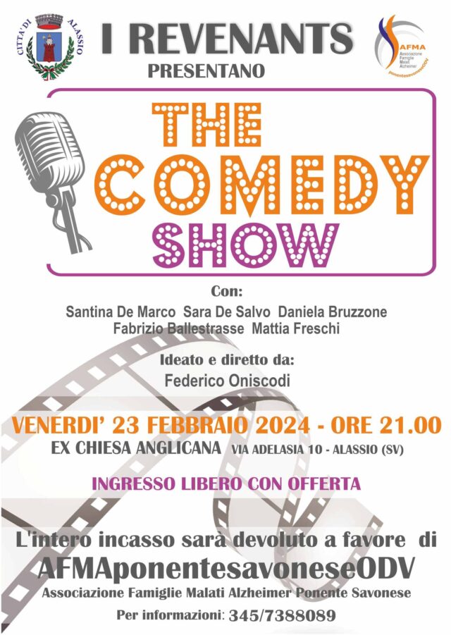 SAVONA – Nell’ex Chiesa Anglicana di Alassio appuntamento con “The Comedy Show”: serata benefica con i “Revenants” a favore dei malati di Alzheimer. Alle ore 21 in Via Adelasia ,10, si svolgerà l’interessante spettacolo organizzato dall’ AFMA (Associazione Famiglie Malati Alzheimer) Ponente Savonese ODV con il patrocinio del Comune di Alassio.