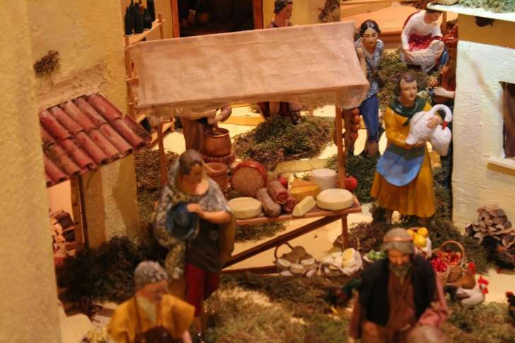 Il piccolo mercato con i banchi di formaggi, salumi, terrecotte e altri articoli, l’acqua che sgorga dalla fontana, i camini accesi negli interni di alcune case, i panni stesi, il cestino che scende dalla finestra, una donna che pompa l’acqua alla fontana, il fabbro che batte alacremente il ferro, l’interno di una vecchia cucina con una signora che prepara la sfoglia con i fuochi accesi nel banco fornelli tipico della Liguria, oltre all’alternarsi delle fasi del giorno e della notte con il cielo azzurro completano questo singolare presepe.
