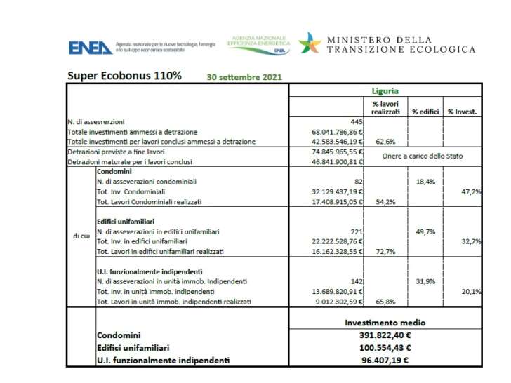 Nel report sono disponibili, raccolti in 22 tabelle, sia i dati nazionali sia quelli relativi a ciascuna Regione. In Liguria il numero di asseverazioni 445 (46.185 in Italia), l’importo degli investimenti ammessi a detrazione. Il valore  è di circa 68 milioni (poco meno di 7 miliardi e mezzo in Italia).