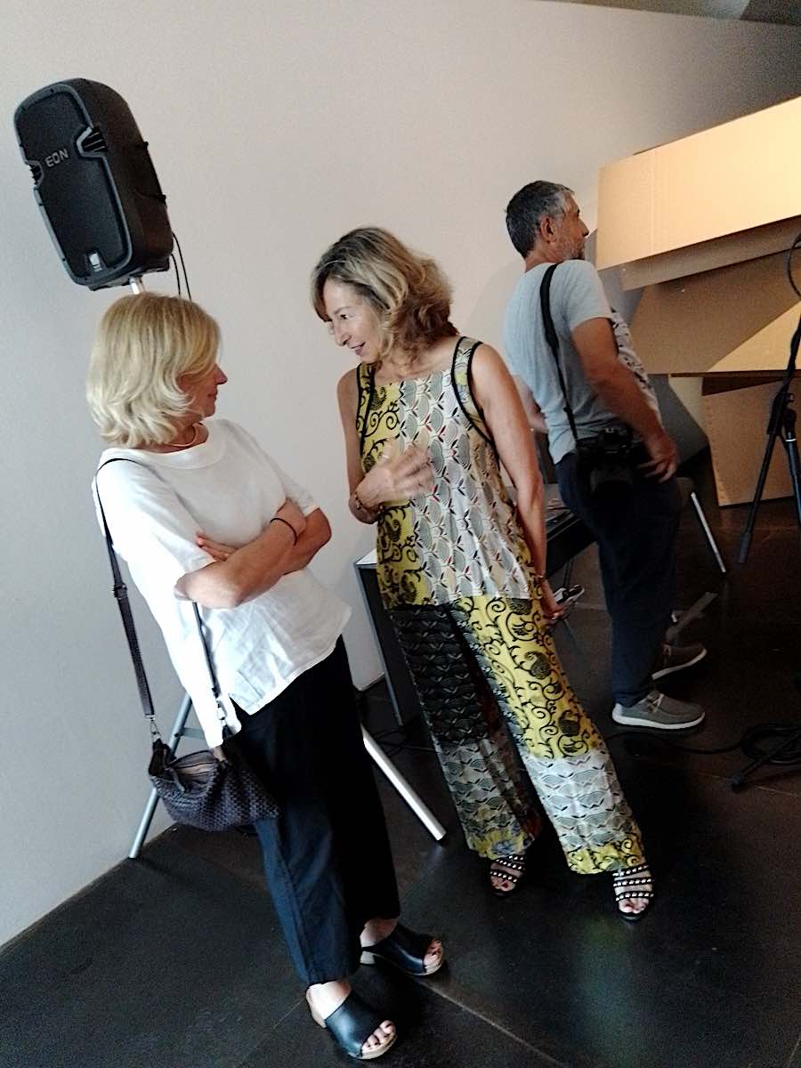 La Sicignano la conosciamo tutti: regista, autrice, fondatrice e direttrice dal 1994 del Teatro Cargo a Genova, poi  Direttrice del Teatro Stabile di Catania dal 2018 al 2022. Ha ricevuto  premi e riconoscimenti tanto in Italia che all’estero per i suoi testi e le sue regie. Di Franziska Greber conosciamo senz’altro meno anche se, come ha detto lei stessa in conferenza,  è nella nostra città da tre anni. Artista svizzera, psicoterapeuta, fondatrice del progetto artistico globale WOMEN IN THE DARK contro la discriminazione e la violenza (2016), nel 2023 ha ricevuto anche il Premio d’arte tedesco “The Power of the Arts”. Le sue opere  sono state presentare in giro per il mondo che lei ha visitato in ogni dove.