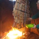 Alle cinque circa si accende il fuoco e si inizia la lenta cottura, ruotando regolarmente il telaio in modo da rendere il calore uniforme.
