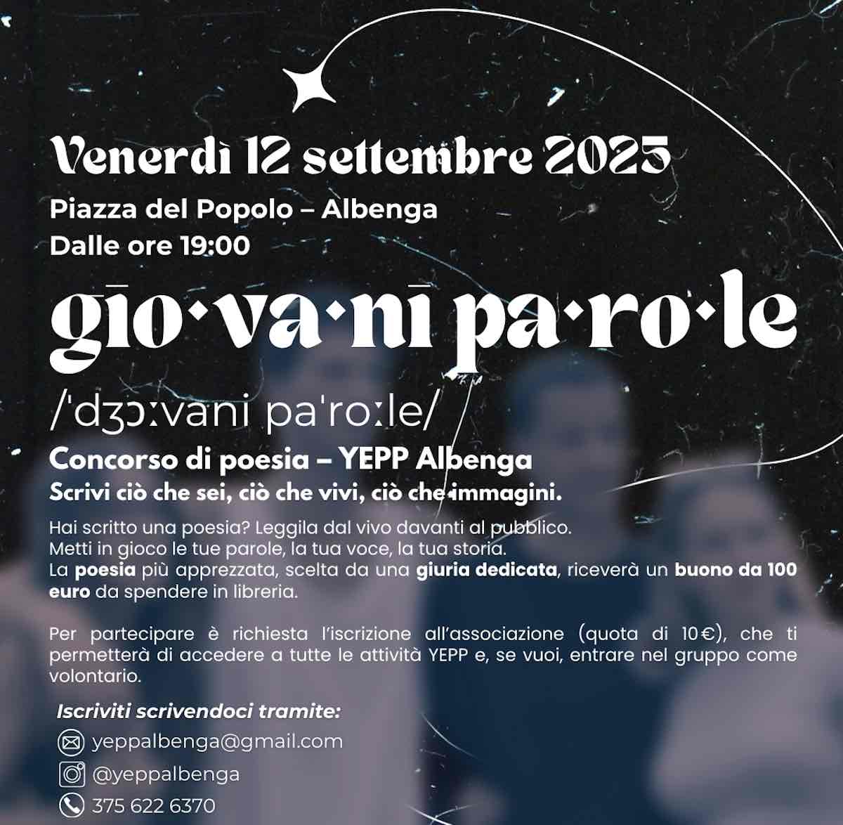 “Lo scopo di YeppAlbenga – spiegano gli organizzatori- è quello di aiutare i giovani di età compresa tra i 14 e 30 anni a realizzare i loro sogni ed a migliorare la qualità della vita in cui vivono. Per questo organizziamo eventi, concerti, corsi ed incontri. Giovani Parole è proprio una iniziativa che si inserisce pienamente in questo nostro programma”. L’appuntamento è per le ore 19 quando i poeti presenteranno, sul palco della principale piazza cittadina, le loro composizioni. “Ci rivolgiamo- dicono allo Yepp Albenga- ai giovani che hanno scritto una poesia e desiderano leggerla dal vivo davanti al pubblico. A coloro che desiderano mettere in gioco le proprie parole, la propria voce, la propria storia”. La poesia più apprezzata riceverà un buono da cento euro da spendere in libreria.