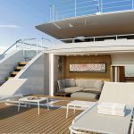 Lo spostamento a prua dell’alloggio dei tender ha permesso di ridisegnare completamente l’area di poppa: qui un grande beach club di 47mq ospita una zona conversazione con bar, gym e bagno turco rendendolo spazio ideale da cui godere di momenti di relax a contatto con il mare.
